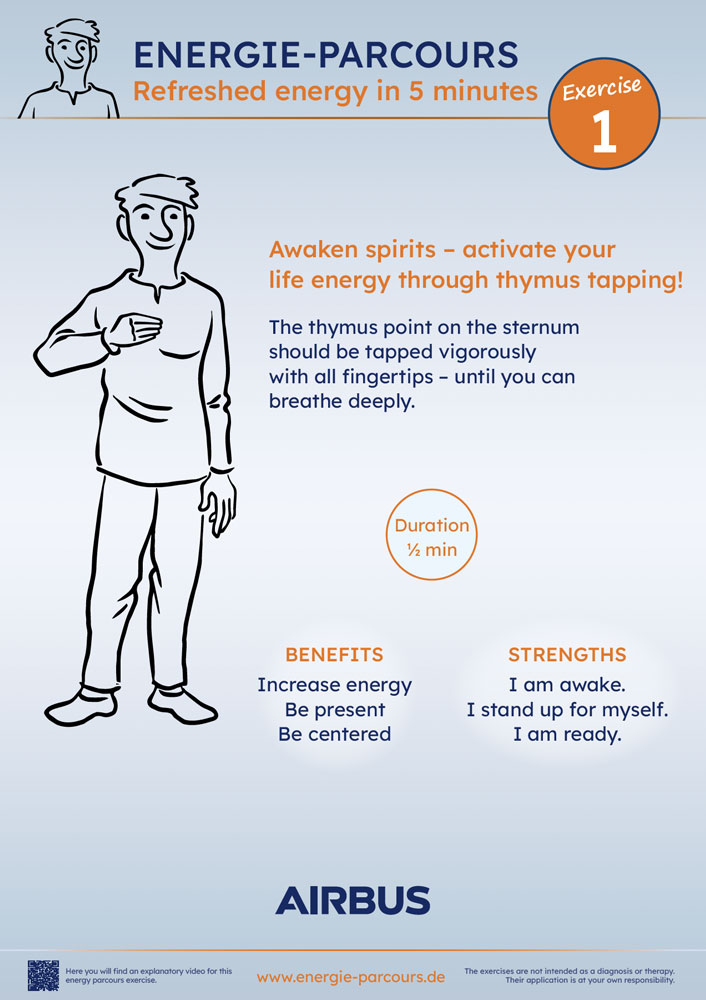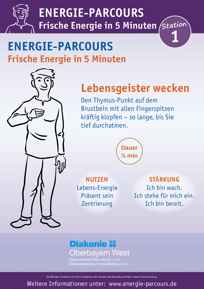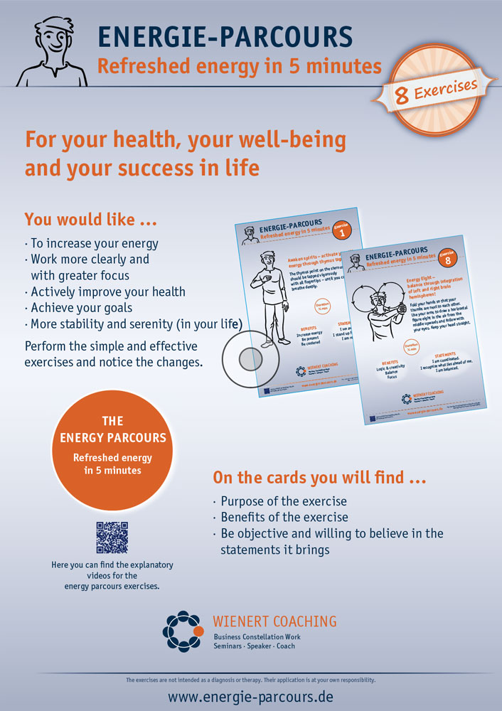 Der Energie-Parcours besteht aus 8 kurzen Übungen, leicht erlernbaren Übungen, die in ihrer Kombination darauf ausgerichtet sind, das eigene Energiesystem zu aktivieren, Stress abzubauen und Klarheit sowie innere Stabilität zu fördern.